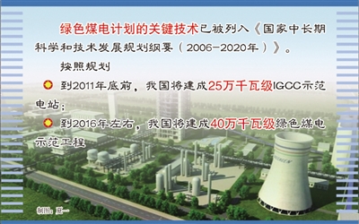 目前,绿色煤电计划的关键技术已被列入《国家中长期科学和技术发展规划纲要(2006-2020年)》,并将分3个阶段开发出可推广的绿色煤电示范电站。按照规划,到2011年底前,我国将建成25万千瓦级IGCC示范电站;到2016年左右,我国将建成40万千瓦级绿色煤电示范工程。