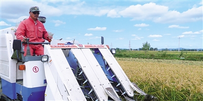 上图 大荒地村种植公司职工在操作收割机收割水稻。 本报记者 李己平摄
