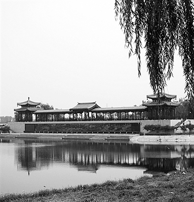 在公园最南端的武窑桥,建有一座码头外型的建筑,滨水的台阶,长长的回廊,临水的墙壁上还镶嵌着一幅巨大的黑色大理石金线白描画轴。走近一看,原来是清代画家江萱的《潞河督运图》,长长的影壁上再现了古时的漕运场景。登上码头,来到凉亭,悠扬的乐曲传来,哦,原来这里还是“民间演奏会”的活动场所。每天下午,人们会带着各自的乐器,来到这运河之上的凉亭。记者看到,这里弹琴的弹琴,吹笛的吹笛,还有琵琶、二胡,共同演奏和谐曲。