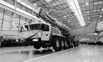 这是三一重工86米臂架泵车长沙下线仪式(9月19日摄)。 由三一重工自主研制的世界最长86米臂架泵车,采用世界首创7节臂设计,施工范围较5节、6节臂更广更灵活。 新华社记者 龙弘涛摄