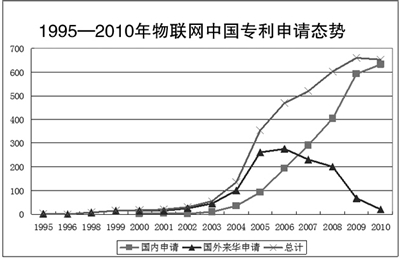 本次物联网中国专利检索自中国专利局CPRS数据库,检索时间为2011年5月10日,共检索到相关专利申请3542件。从专利申请数量的发展趋势来看,从2005年开始,该领域专利申请数量开始高速增长,从2007年开始,国内申请量开始大幅增长,这与国内物联网技术发展的启动,在时间上是吻合的。