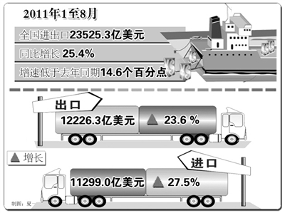 从目前的数据来看,今年的外贸出口实现了年初预定的两个方面的目标:第一是外贸增长要稳出口,比GDP增速要快。1至8月份出口增速达到了23.6%,明显快于GDP的增速;第二是我国提出外贸发展要“转方式、调结构、促平衡”,目前已取得积极成效,外贸发展呈现积极变化。