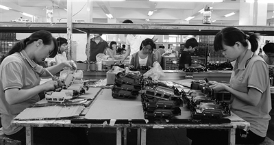 由于美债危机和欧债危机的影响,欧美市场严重萎缩,在这种情况下,广东汕头市澄海区玩具企业坚定地走自主品牌之路,通过开发新产品、开拓新市场、对企业进行转型升级,外贸出口稳中有升。今年上半年,澄海区玩具业在本地海关出口额达2.7059亿美元,同比增长26.8%。图为玩具企业员工在组装遥控玩具汽车。 新华社记者 卢汉欣摄