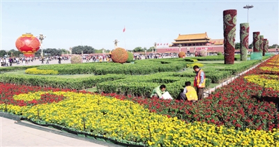 为庆祝中华人民共和国成立62周年,天安门广场将布置“祝福祖国”大型立体中心花坛、地栽花卉、花柱、花球等景观,全部摆花任务计划在9月25日全部完成。 新华社记者 罗晓光摄