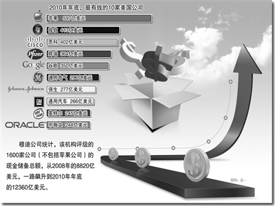 据穆迪公司统计,该机构评级的1600家公司(不包括苹果)的现金储备总额,从2008年的8820亿美元,一路飙升到2010年年底的12360亿美元。2010年年底,最有钱的10家美国公司分别是苹果(597亿美元)、微软(413亿美元)、思科(402亿美元)、辉瑞(364亿美元)、谷歌(350亿美元)、通用电气(296亿美元)、强生(277亿美元)、通用汽车(266亿美元)、英特尔(245亿美元)、甲骨文(244亿美元)。