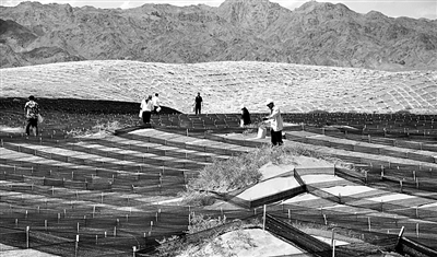 下图:阿拉善盟采取生物固沙和工程固沙相结合的办法,遏制巴丹吉林沙漠东侵南移。