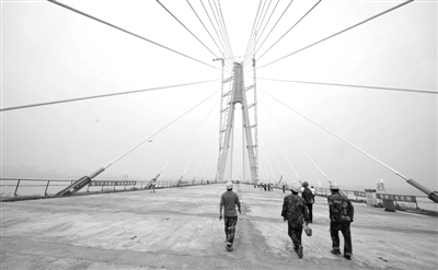9月27日,工人走在合龙后的武汉二七长江大桥上。