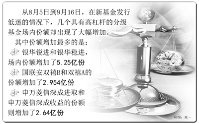 数据显示,从8月5日到9月16日,在新基金发行低迷的情况下,几个具有高杠杆的分级基金场内份额却出现了大幅增加。