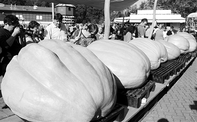 第八届柏林和勃兰登堡地区南瓜称重大赛在克莱斯多夫小镇举行。本次参赛的南瓜有400余种,总数超过10万个。经称重,获得今年“南瓜王”称号的是一个303公斤的大南瓜。图为游客在参观。 新华社发