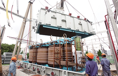 国家电网泉州电业局对220千伏井山变电站进行增容改造。图为技术人员在检查吊罩。 李智超摄