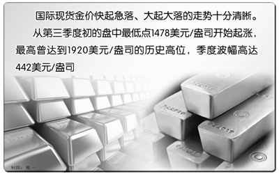 国际现货金价从当季开始时的盘中最低点1478美元/盎司开始起涨,最高曾达到1920美元/盎司的历史高位,季度波幅高达442美元/盎司。在此期间,以9月6日现货金创下历史新高的那天为分水岭,其快起急落、大起大落的走势十分清晰。