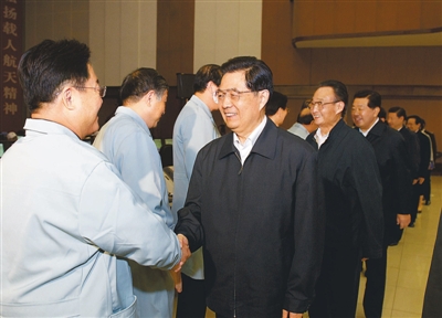 在酒泉卫星发射中心指挥控制大厅,温家宝等领导同志与现场参试人员热情握手,祝贺发射成功。