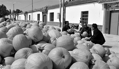 金秋时节,甘肃省玉门市种植的两万亩南瓜喜获丰收,远销到新疆、青海。图为外地客商在玉门市下西号乡西红号村收购南瓜。