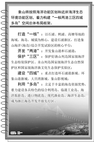 今年3月,《浙江海洋经济发展示范区规划》正式上升为国家战略。浙江大地春潮雷动,掀起了发展海洋经济的热潮。象山伺机而动,抢占了先机。今年9月,浙江省第一个海洋综合开发与保护试验区落户象山。规划要求象山重点发展临港装备制造业、海洋新兴产业、海洋旅游业、现代渔业和海洋服务业,抢占海洋经济未来发展的战略制高点。