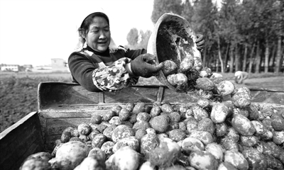 10月10日,在青海省大通回族土族自治县长宁村,村民在地里收马铃薯。在即将进入深秋之际,青海省东部农业区迎来新一轮马铃薯收获高峰期。 新华社记者 张宏祥摄