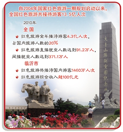 据悉,通过发展红色旅游,临沂的“红色”品牌产品已达数百个,涉及上百个门类,带动了数十万人走上了致富路。2010年,临沂市红色旅游共接待国内游客1460万人次,红色旅游综合收入超100亿元。