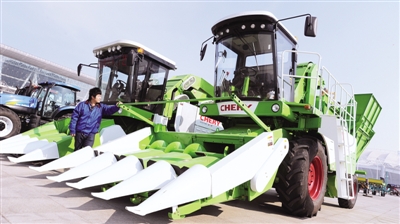 10月11日拍摄的一款国产大马力玉米收获机。2011哈尔滨农业博览交易会将于10月13日至17日在哈尔滨举办,世界各地的农用机械厂商纷纷将国际最先进的大马力农用机械运抵哈尔滨参展和销售。 张清云摄(新华社发)