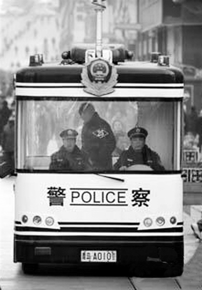 右图 山东省青岛市公安局自主研发的“流动警务室”正在步行街执行警务。