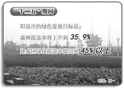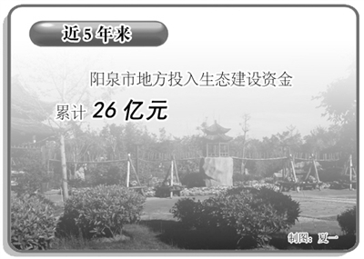近5年来,阳泉市地方投入生态建设的资金累计达26亿元,经过大力治理,天蓝了,水清了,而更大的收获在于“生态环境是最大的优势”已经成为阳泉人的共识。“十二五”期间,阳泉市的绿色发展目标是:森林覆盖率将由现在的25.94%上升到35.9%,建成区绿化覆盖率从目前的38.64%提高到45%以上。