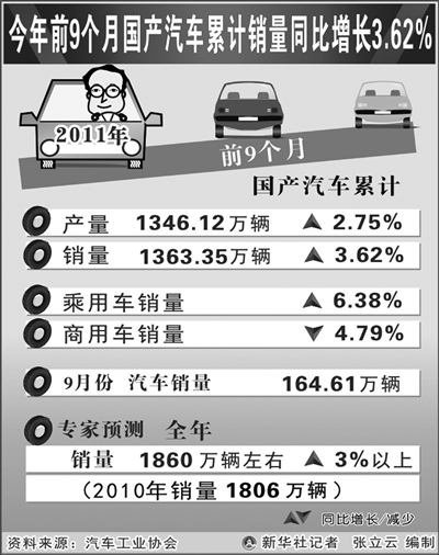 中国汽车工业协会发布的最新统计数据显示,今年前三季度,我国汽车累计产销1346.12万辆和1363.35万辆,同比分别增长2.75%和3.62%,呈现小幅平稳增长态势。