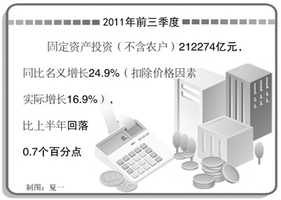 一方面,经济增长动力仍然比较强劲,具有持续性。从投资看,今年是“十二五”开局之年,各地加快固定资产投资的积极性比较高。前三季度固定资产投资增速为24.9%,虽然比前两个月有所回落,但回落幅度不大,仍在高位运行。投资结构更是出现积极变化,民间投资增速较高,并且比重在上升。1至9月份,民间投资增速高达34.2%,比全社会固定资产投资增速高出9个百分点以上。在固定资产投资总额中,民间投资所占比重进一步上升到59%,这说明投资的内生动力也在增强。