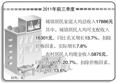 经济运行效益的提高,主要表现在国家、个人、企业等几大主体的收入都在稳步增加。其中,前三季度中央财政收入比去年同期增长29.5%;城镇居民人均可支配收入实际同比增长7.8%;农村居民人均现金收入实际同比增长13.6%;1至8月份规模以上工业企业实现利润同比增长28.2%。