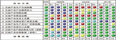 灯号:2011年三季度,在构成中经石油产业预警指数的10个指标(仅剔除季节因素,保留随机因素)中,位于“绿灯区”的为石油产业生产合成指数、石油产业产品销售收入、石油产业利润总额、石油产业税金总额、石油产业从业人员数、石油产业进出口总额和石油产业应收账款(逆转⑥);位于“黄灯区”的是石油产业生产者出厂价格指数;位于“浅蓝灯区”的是石油产业产成品资金占用(逆转);位于“蓝灯区”的是石油产业固定资产投资总额。