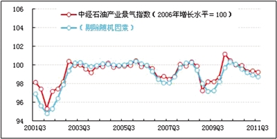 中经石油产业景气指数报告显示,2011年三季度中经石油产业景气指数为99.3点,较上季度微降0.1点;中经石油产业预警指数为93.3点,与上季度持平,目前处于“绿灯区”中心线以下。