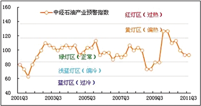 预警:2011年三季度,中经石油产业预警指数为93.3点,目前处于“绿灯区”中心线以下的位置,仍处于正常区间。