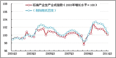 进一步剔除随机因素后,石油产业生产合成指数为100.6点(见石油产业生产合成指数走势图中的蓝色曲线),较上季度下降1.2点,呈现加速回落的态势。