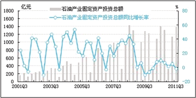 经初步季节调整,2011年三季度石油产业固定资产投资总额为1393.4亿元,同比下降1.3%,环比增长21.7%。