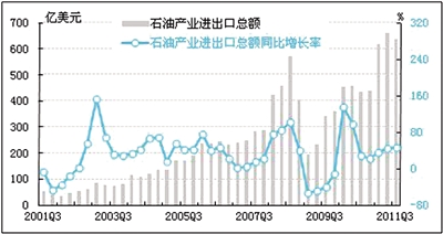 经初步季节调整,2011年三季度石油产业进出口总额为639.3亿美元,同比增长46.3%,同比增速较上季度上升1.5个百分点;环比下降3.5%。
