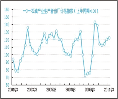 2011年三季度,石油产业生产者出厂价格同比上涨22.8%,涨幅较上季度扩大1.9个百分点。