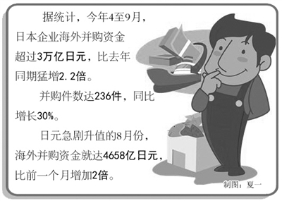 另一个动向是日本企业加快海外并购步伐。据统计,今年4至9月,日本企业海外并购资金超过3万亿日元,比去年同期猛增2.2倍。并购件数达236件,同比增长30%。日元急剧升值的8月份,海外并购资金就达4658亿日元,比前一个月增加2倍。