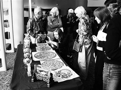 10月20日,美国观众在加州长滩大学欣赏中国天津非物质文化遗产展品。 “2011中国电影文化周”20日上午在美国加利福尼亚州长滩大学开幕。主办方向美国观众奉献出一台集电影展映、非物质文化遗产展示和京剧表演等多种艺术形式于一体的文化盛宴,以增进中美两国人民之间的了解和友谊。 新华社记者 王 军摄
