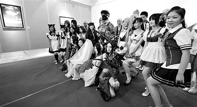 在文化部“原创动漫边疆推广计划”走进新疆的活动现场,乌鲁木齐市的动漫爱好者与卡通模特们合影。