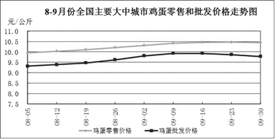 受中秋节食品加工企业用蛋需求增加以及养殖成本提高支撑,鸡蛋价格高位运行。9月份,全国主要大中城市鸡蛋批发价格平均为9.9元/公斤,比8月份上涨4.3%;零售价格平均为10.4元/公斤,上涨3.4%。