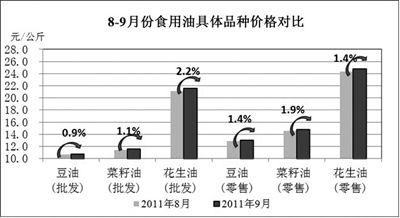 油脂市场进入季节性消费旺季,尤其中秋、国庆节前零售终端补库需求明显,9月份,全国主要大中城市桶装食用油批发价格平均为14.6元/公斤,比8月份上涨1.6%。其中,花生油、菜籽油、豆油批发价格分别上涨2.2%、1.1%和0.9%。食用油零售价格平均为16.9元/公斤,比8月份上涨1.7%。其中,花生油、豆油、菜籽油价格分别上涨1.9%、1.4%和1.4%。