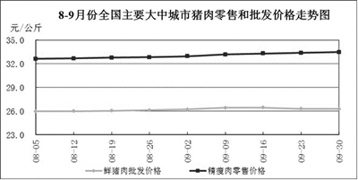 9月份,全国主要大中城市鲜猪肉平均批发价格和精瘦肉平均零售价格分别为26.3元/公斤和33.3元/公斤,比8月份分别上涨1.1%和2.7%。9月份鲜猪肉批发价格第一周、第二周环比上涨0.7%和0.1%,快速上涨势态得到缓解;下半月,随着生猪出栏量较为集中,市场供应增加,价格有所回落,第三周、第四周环比下降0.6%和0.1%。