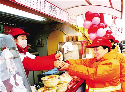 10月24日,哈尔滨市环卫工人领取免费早餐。从即日起,哈尔滨市所有从事清晨人工清扫作业的一线环卫工人都可以从路边的早餐车上免费得到一份价值5元的营养早餐。据统计,每天有4354名从事清晨人工清扫作业的环卫工人吃到免费的营养早餐。 新华社记者 管建涛摄
