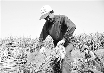 作为山东大姜主产区的乳山市4万多亩大姜喜获丰收,平均亩产达到6000公斤。乳山市积极组织当地大姜生产龙头企业、合作社以保护价进行收购,引导姜农半售半贮,科学应对市场风险。图为乳山市大孤山镇上册村农民在收获大姜。 本报记者 单保江 通讯员 刘国贤摄影报道