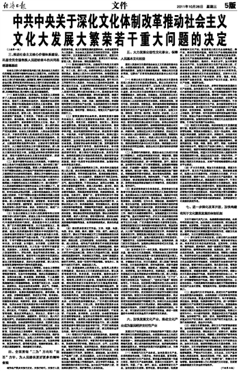 中共中央关于深化文化体制改革推动社会主义 文化大发展大繁荣若干重大问题的决定