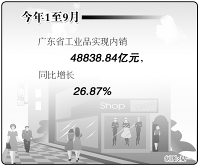 本报讯 记者庞彩霞报道:今年以来,广东省全面贯彻落实中央各项宏观调控政策,继续加大扩内需、稳外销的力度,加快调整经济结构。1至9月,工业品实现内销48838.84亿元,增长26.87%,增幅比同期出口增速高12.77个百分点,内销占全部工业品销售的比重为69.61%,同比提高2.3个百分点。在外需增幅减缓的情况下,扩内需成为稳定广东工业经济增长的主要动力。