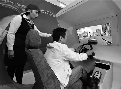 10月26日,一位参观者在中新天津生态城智能电网综合示范工程项目展示平台体验电动汽车。近日,中国首个智能电网综合示范工程在中新天津生态城投运。中新天津生态城智能电网工程涉及发电、输电、变电、配电、用电、调度6大环节12个子项目的示范工程。 新华社记者 刘海峰摄