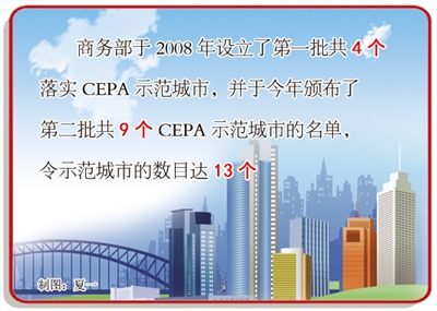 商务部于2008年设立了第一批共4个落实CEPA示范城市,并于今年颁布了第二批共9个CEPA示范城市的名单,令示范城市的数目达13个。其中,有南京、苏州、青岛、济南、南宁、乌鲁木齐、上海浦东新区、重庆北部新区8个城区,以及5个广东城市——深圳、广州、珠海、佛山及东莞。