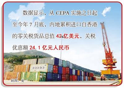 CEPA实施近8年来,各项措施得到了很好落实。数据显示,从CEPA实施之日起,至今年7月底,内地累积进口自香港的零关税货品总值42亿美元,关税优惠额24.1亿元人民币。2400多家香港服务提供者按照CEPA的优惠措施赴内地投资。香港银行开展人民币业务,在港累积人民币存款约5500亿元。在内地注册的香港个体工商户4000余家,从业人员1.3万人。另外,内地赴港“个人游”旅客累计已达7000万人次,占内地旅客总数的53%。