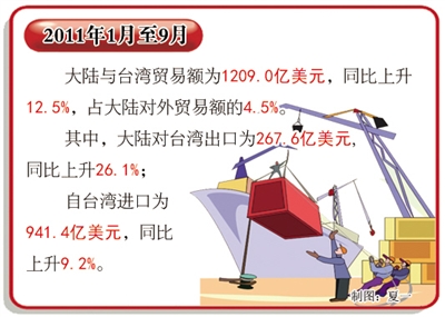 1至9月,大陆与台湾贸易额为1209.0亿美元,同比上升12.5%,占大陆对外贸易额的4.5%。其中,大陆对台湾出口为267.6亿美元,同比上升26.1%;自台湾进口为941.4亿美元,同比上升9.2%。截至2011年9月底,大陆累计批准台资项目85063个,实际利用台资536.6亿美元。