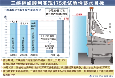 据新华社宜昌10月30日电 (记者刘紫凌 冯国栋) 30日17时,三峡水库水位升至175米正常蓄水位。历时近2个月调蓄,世界最大水利枢纽三峡枢纽顺利实现了175米试验性蓄水目标。