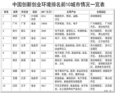 本报讯 清华大学启迪创新研究院近日首次公开发布其针对2010年我国大陆地区GDP过千亿、人均GDP排名前100的地级以上城市(不包括直辖市)的《中国城市创新创业环境排行榜》,深圳、广州、杭州、南京、苏州、武汉、西安、成都、无锡、沈阳位居前10。