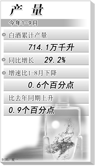 从产量上来看,白酒产量比去年同期有所增长。1月至9月,白酒产量累计达714.1万千升,同比增长29.2%,增速比1月至8月下降0.6个百分点,比去年同期上升0.9个百分点。